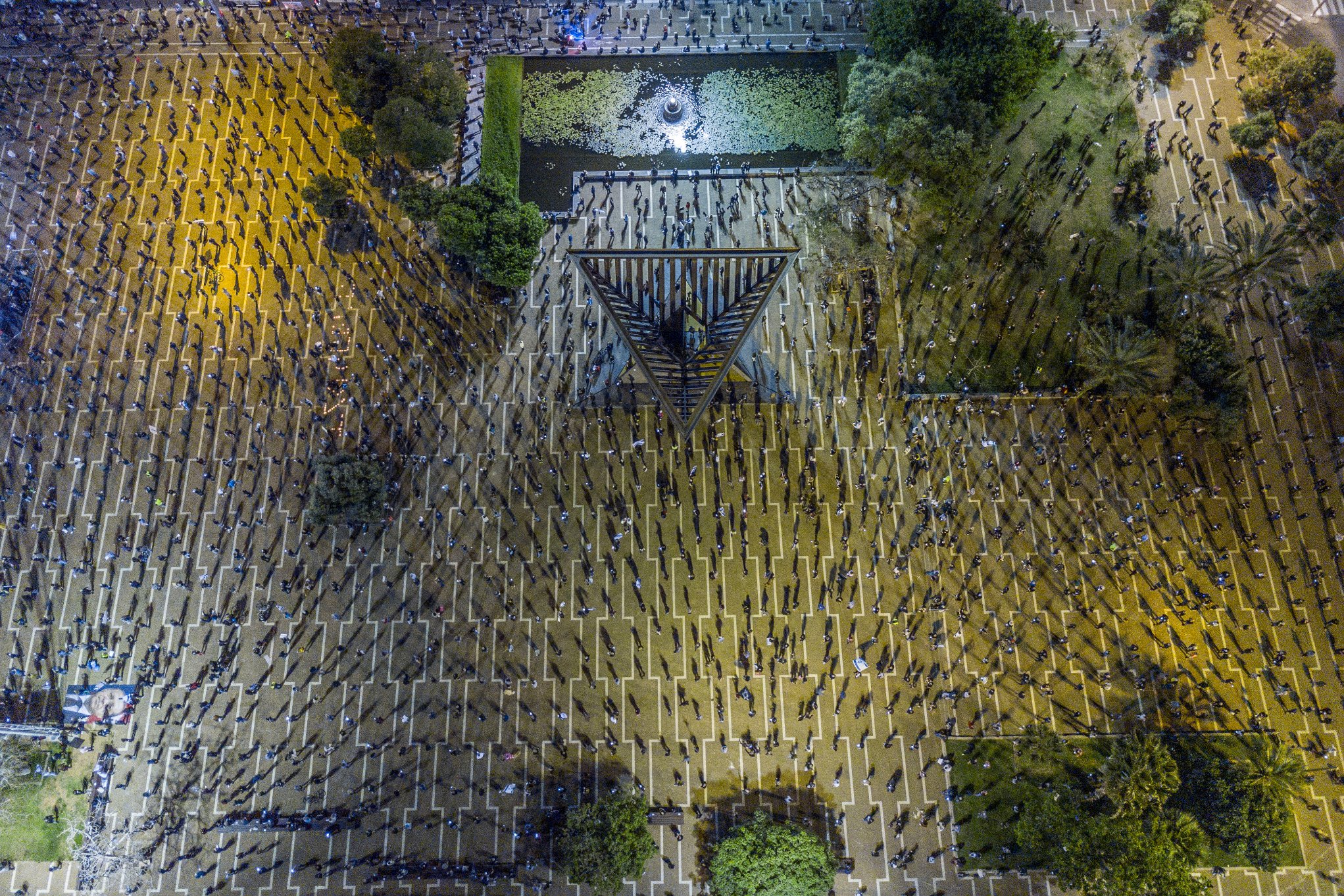 A protester sits as fire emerges during a demonstration against Israeli Prime Minister Benjamin Netanyahu and his nationalist coalition government's judicial overhaul, in Tel Aviv, Israel July 20, 2023. Reuters/ Corinna Kern