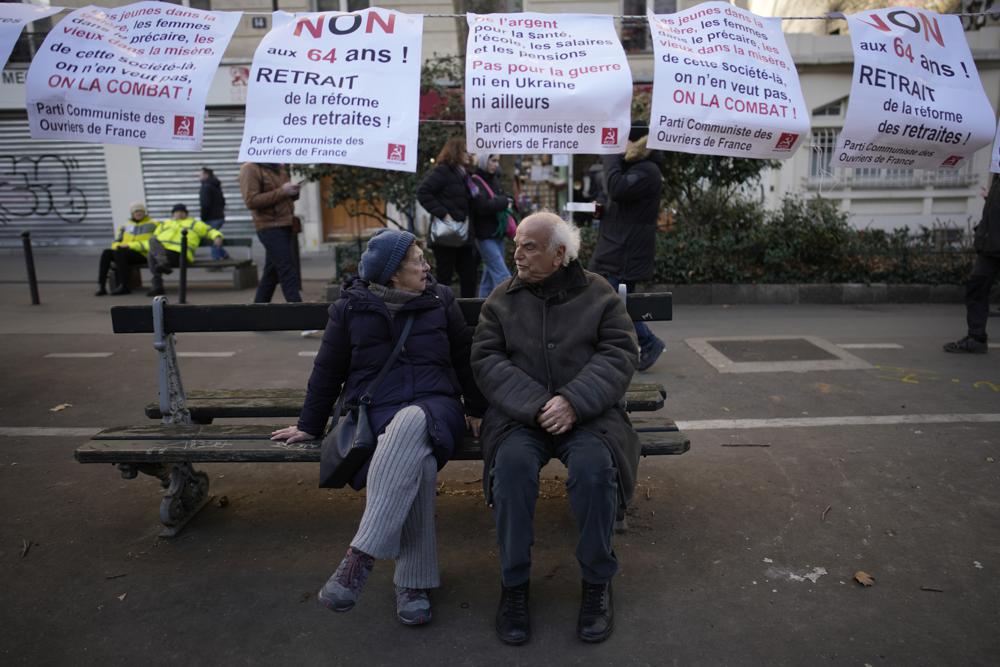 An elderly couple sit on a bench as protesters march during a demonstration against plans to push back France's retirement age, Tuesday, Jan. 31, 2023 in Paris. AP Photo/ Christophe Ena